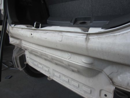 ▼バックドアのへこみの部分の鉄板を出し、へこみを修正します。