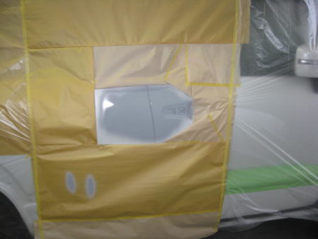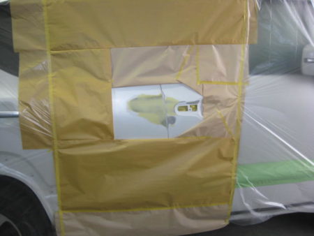 塗料がかかってはまずいドア以外の箇所をマスキングで綺麗に覆いをします。