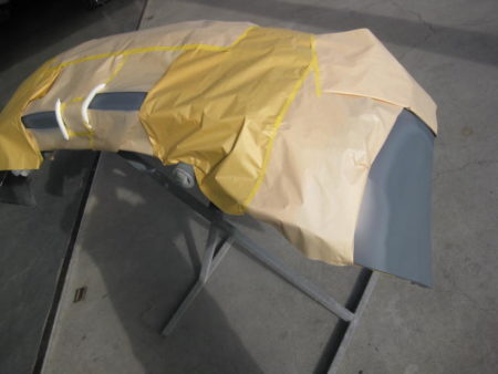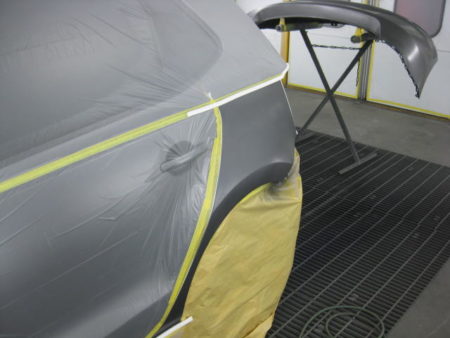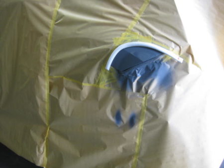 周囲をしっかり養生し、フェンダーに下地処理剤のサフェーサーを吹き付けました。