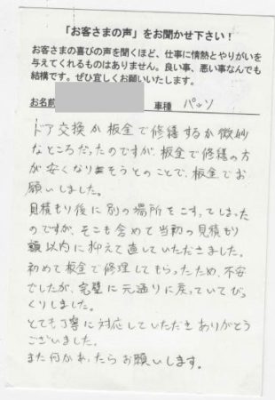 板金塗装修理をしたお客様からのご感想(都城市 トヨタ・パッソ)